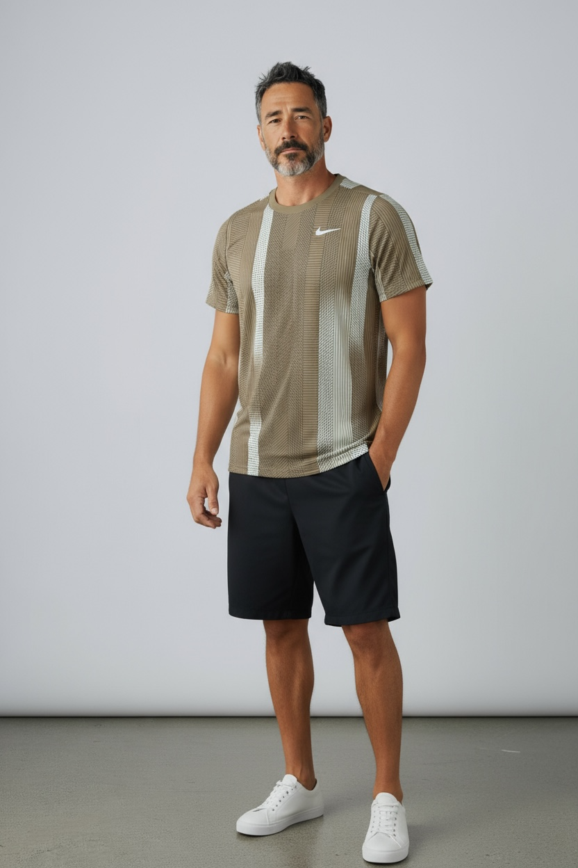 Confeccionada en un tejido técnico ultraligero con tecnología Dri-FIT, esta prenda ofrece máxima transpirabilidad, confort térmico y libertad total de movimiento. El acabado en tonos arena con sutiles reflejos metálicos transmite una elegancia sobria y moderna, ideal para quienes valoran la discreción con carácter.