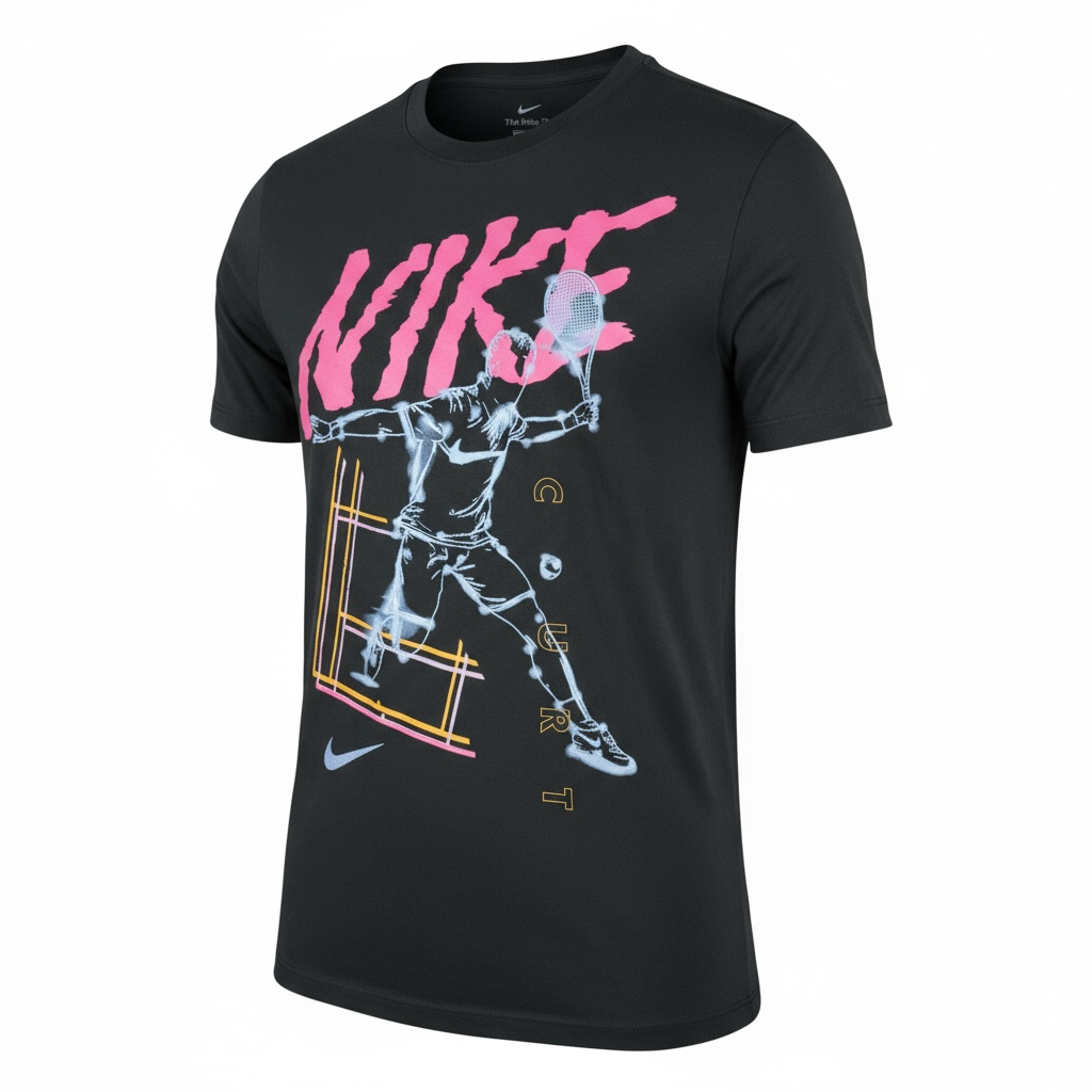 Inspirada en la energía vibrante del tenis moderno, la Nike Court Graphic Tee combina arte, movimiento y actitud competitiva. Su diseño muestra una figura dinámica en pleno saque, rodeada por líneas geométricas que simbolizan precisión y potencia. El logo NIKE en tipografía audaz le da un toque urbano que resalta dentro y fuera de la cancha.